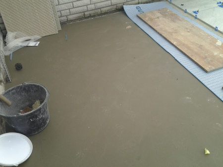 ein Gefälleestrich mit mind. 1,5% - 2% Gefälle auf. Auf diesen Gefälleestrich wird eine Abdichtungsmaßnahme aufgebracht, vorzugsweise eine Verbundabdichtung. Nachfolgend wählt man dann das bevorzugte, je nach Fliesen oder Plattenmaterial, notwendige Verlegesystem.